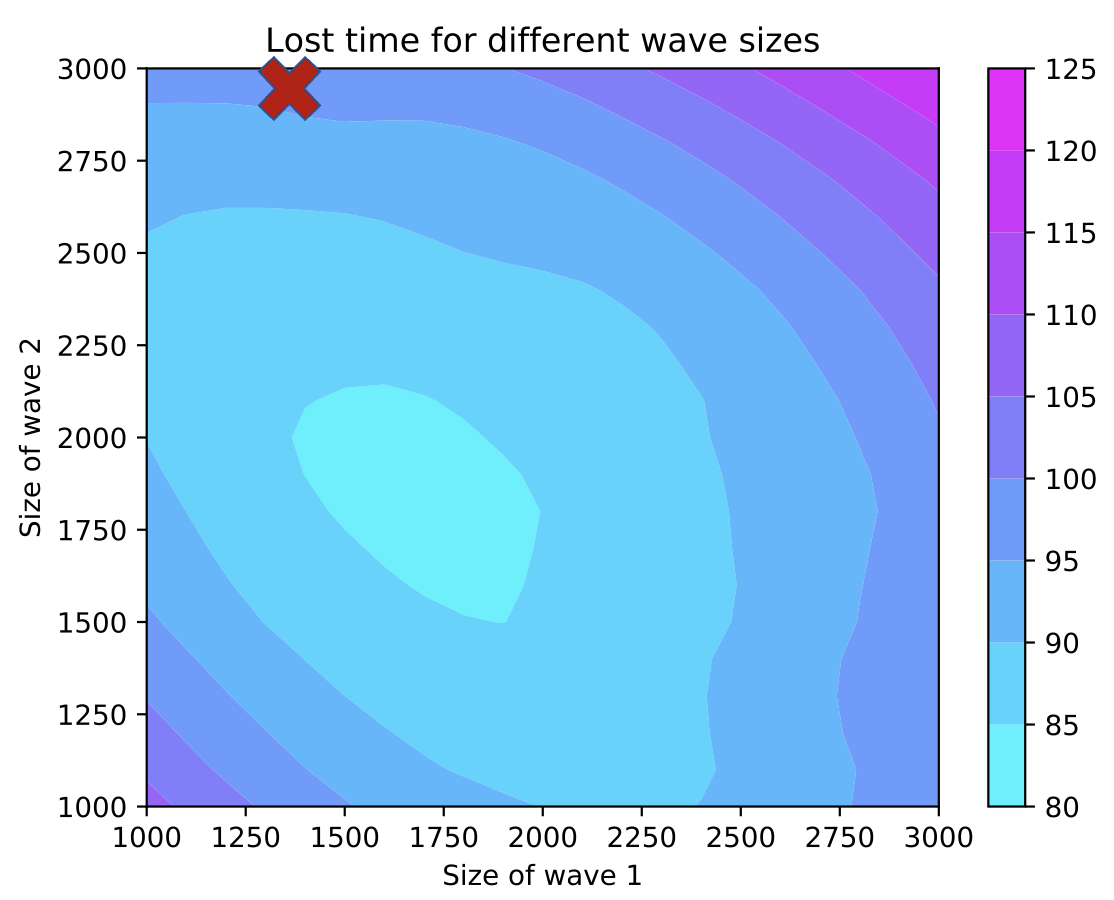 In Fig. 2 we illustrate the average time lost per runner for different wave sizes (keeping the gap between waves fixed). The red cross illustrates the configuration used for the actual race, and the light blue region towards the centre illustrates configurations with less disruptions per runner. In this case the real configuration was sub-optimal, but not horrible; that is, it could have been considerably worse. For the configuration used in practice we predict that the average runners time was around 100s slower because of disrutption, but if the configuration was optimised this woudl drop to around 80s per runner.