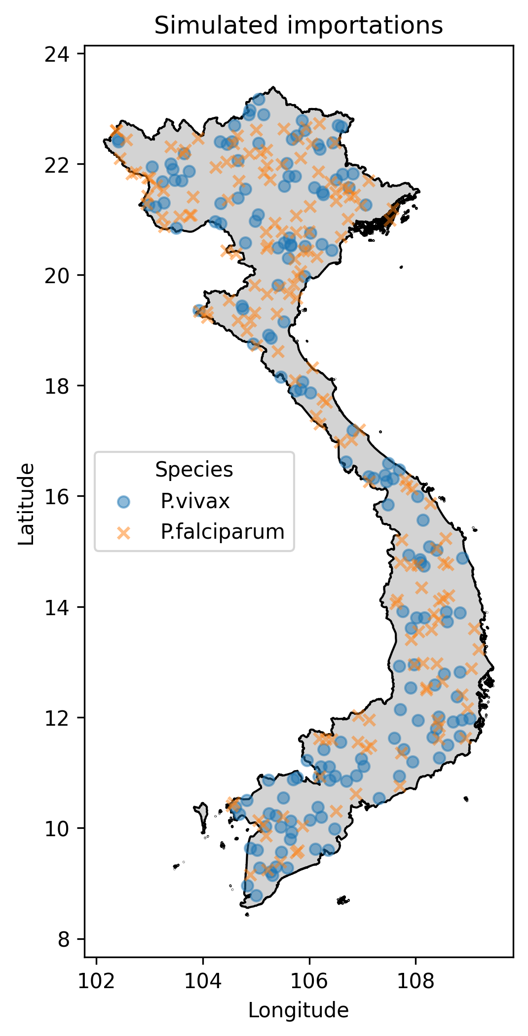 Fig.1 The simulated imported cases, where the marker shape indicates malaria parasite species.