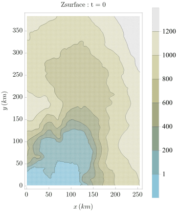 Fig.1 The height of the surface of the Pine Island glacier. This is the output of an example problem included as part of BISICLES. I produced the image using Mathematica.