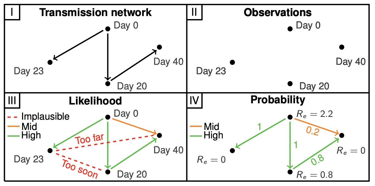 Fig.1 A schematic of the network model that uses case data, augmented to include spatiotemporal seperation between cases, to infer a case-based reproduction number; thus, assigning additional information to each case. This model forms the foundation of subsequent spatial analysis and data-bias correction.