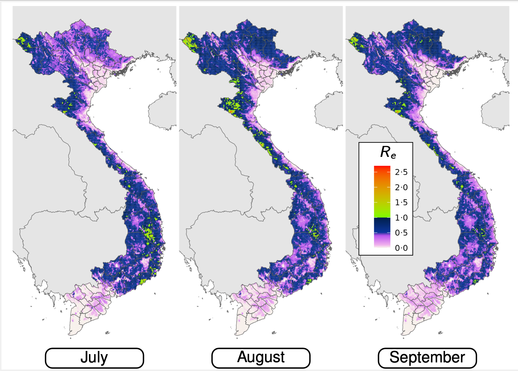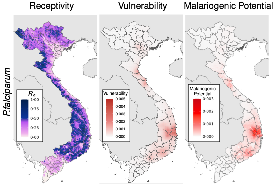 Both of these issues were of concern in this project. Our aim was to provide stragegically useful information to the National Institute of Malaria Prevention and Elimination in Vietnam (NIMPE). This meant developing a modelling framework that could output metrics from the limited available data that were appropriate for the relevant interventions. To do this we used a range of statistical models—including network models, point-process models, and environment-driven geospatial models—to extract as much information as possible from the available data, and produce high-resolution maps. The key metrics we mapped were case-importation rate, malaria receptivity (quantified by the effective reproduction number), and malariogenic potential (a measure of the expected number of malaria cases at a location).